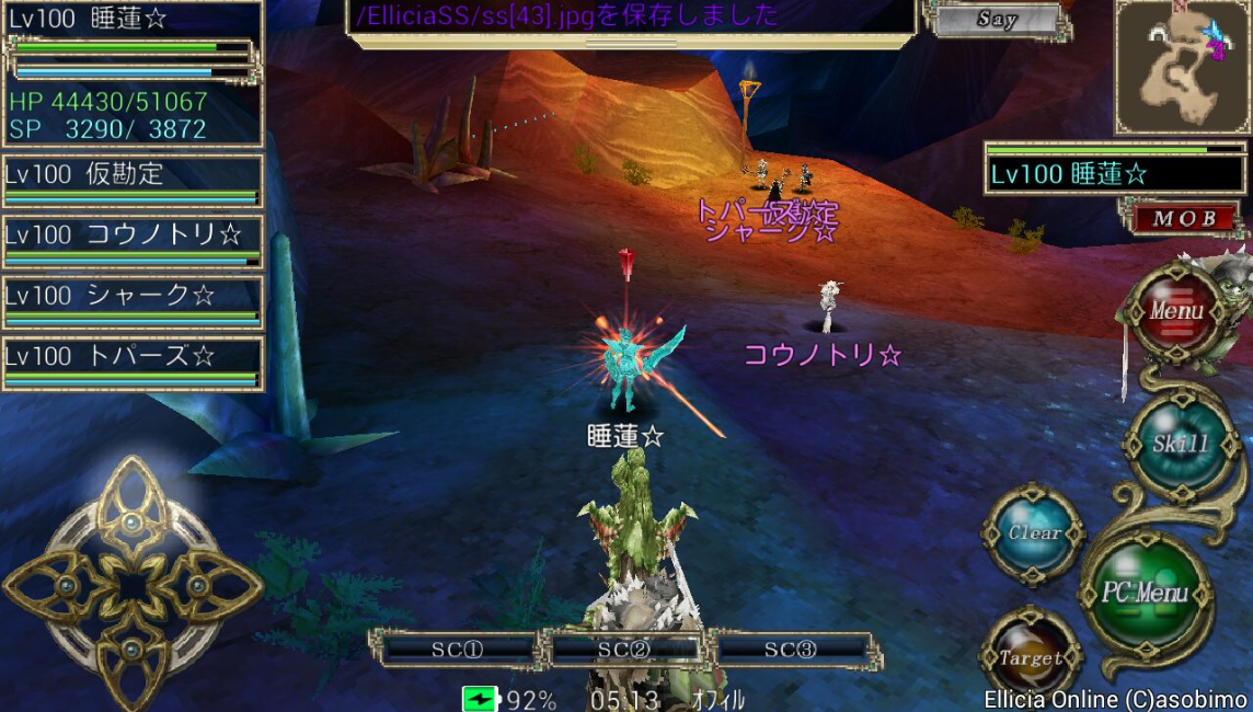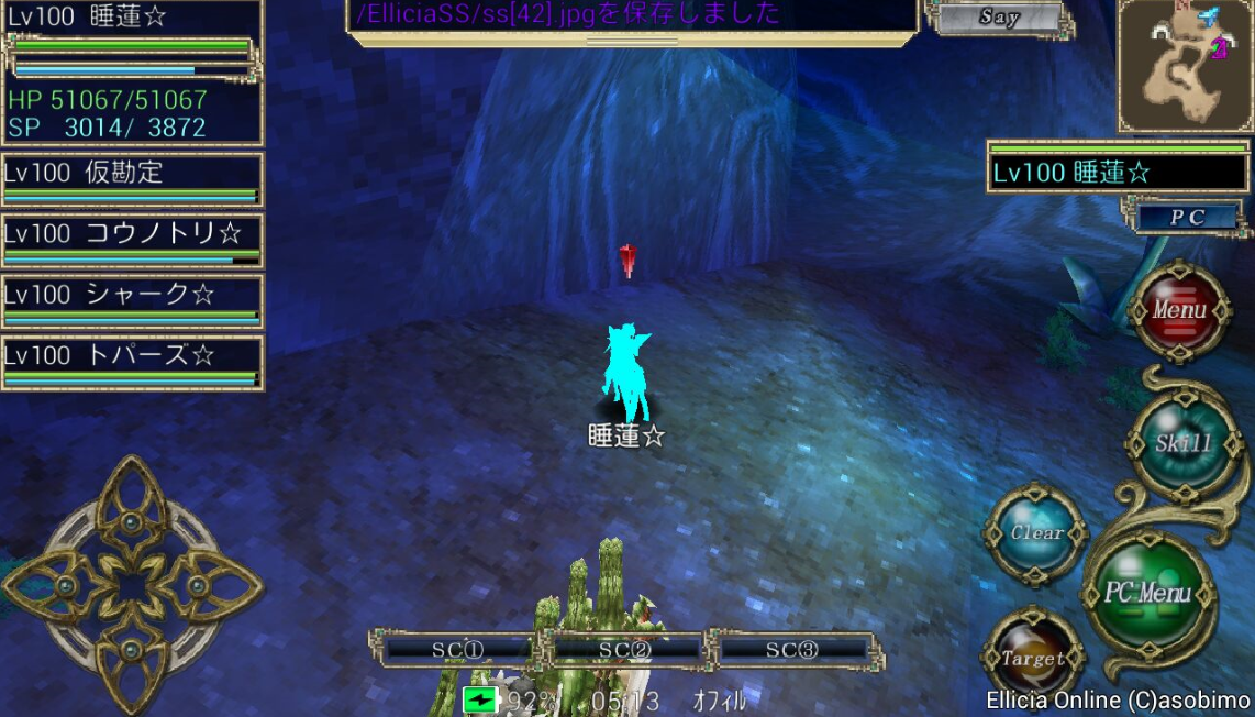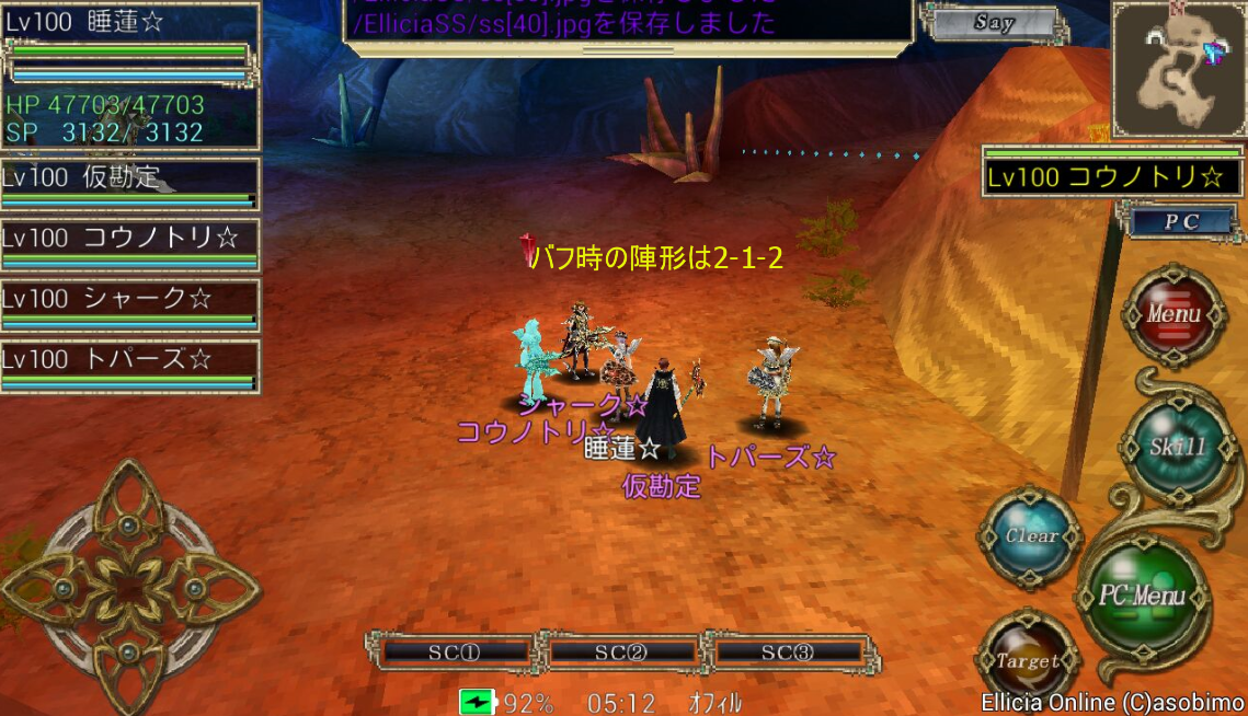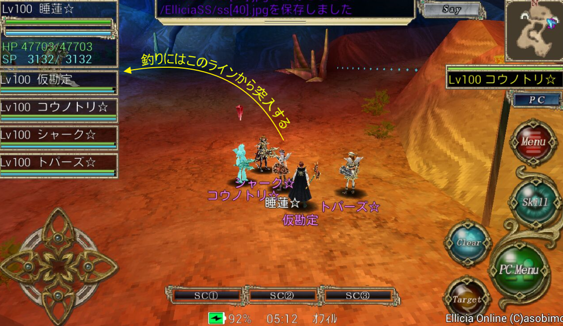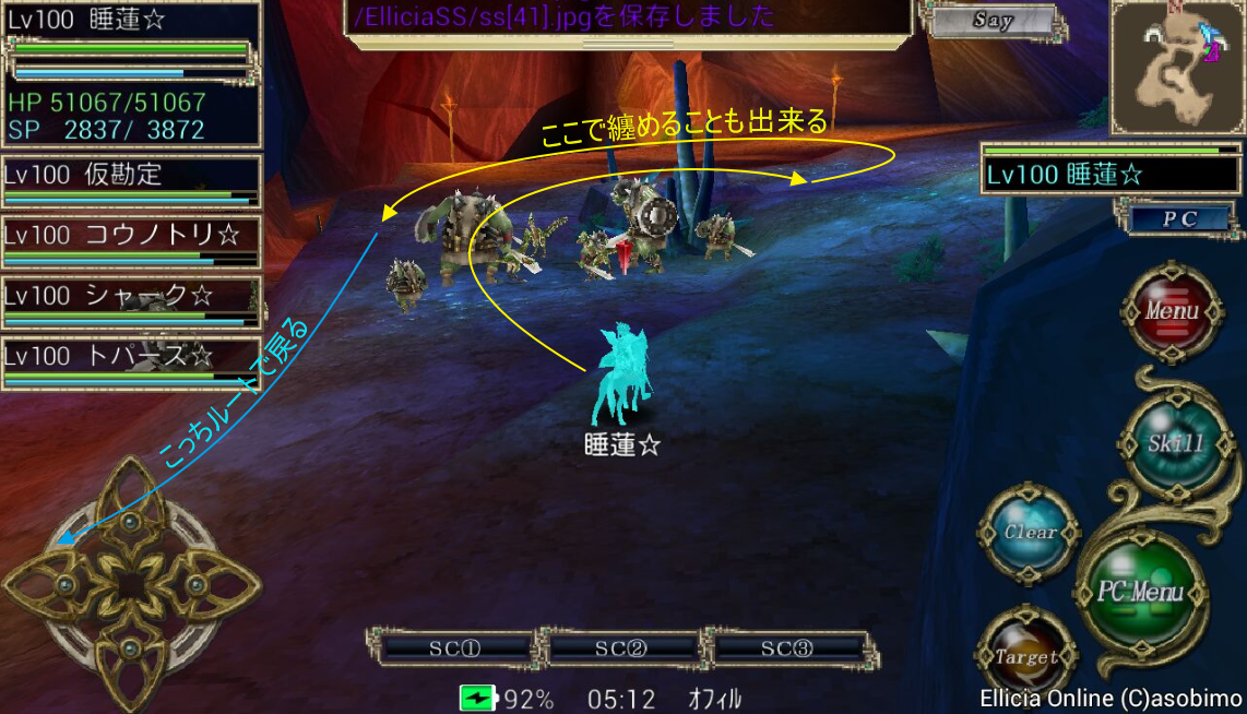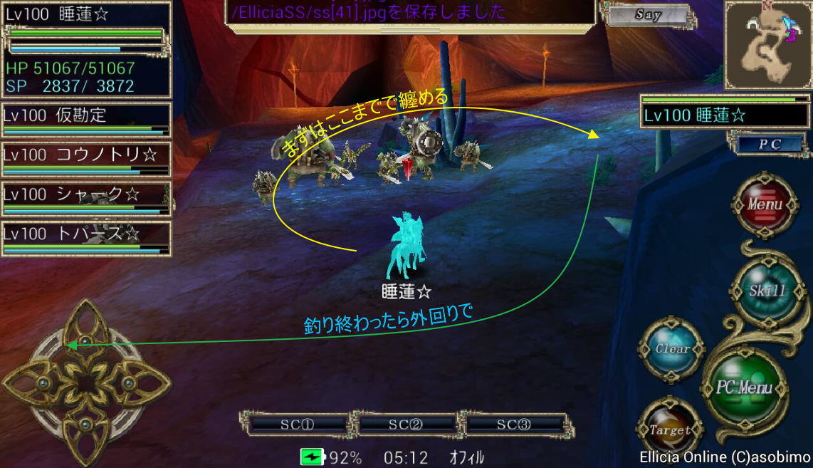 丁度4キャラのエンチャント入力(SC2-0)を終えるとイントロが終わる位なので、そこから睡蓮は走ります。走りながら自己デヒルを最初にし、Eld.アロンジャ地帯を通り抜けます。(自己デヒルのマクロは書き忘れましたがtargetselfからskill ディヴァインヒールです。SC2-3に登録してました)